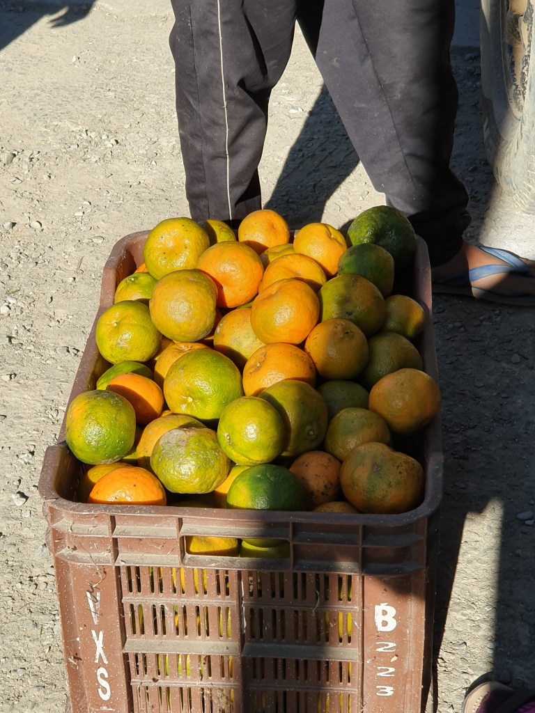 After lunch it is time to visit the orange orchard.First we go to Phejin’s fathers house.It is a large double storied house inside the village.Her duster in.law is vigorously cleaning a large sofa. The family pig sleeps languidly in the afternoon sun.Oranges are packed up in bamboo baskets.More oranges arrive in 4×4 jeeps. The ladies do a photoshoot in a tractor.The jeep carries us through rough kutccha roads to the bottom of a valley .We have come to the orchard. It is a large place with trees everywhere laden with ripe oranges.We are encouraged to eat as many as we can.Phejin’s parents are there supervising the harvest.His father proudly shows us his land.It stretches to the horizon. Across the valley are hills,and Myanmar beyond them.Her mother is sitting by an open fire. There is pork roasting above the fire.Workers sit by the fire.Empty liquor bottles line the corner.Alcohol is officially prohibited in Nagaland