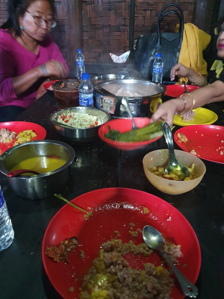 Next we break for lunch,to be had at a hotel where we are supposed to meet the headhunters.They are late.Word is sent out and we have lunch.It is a basic affair with rice and chicken,very tasty.