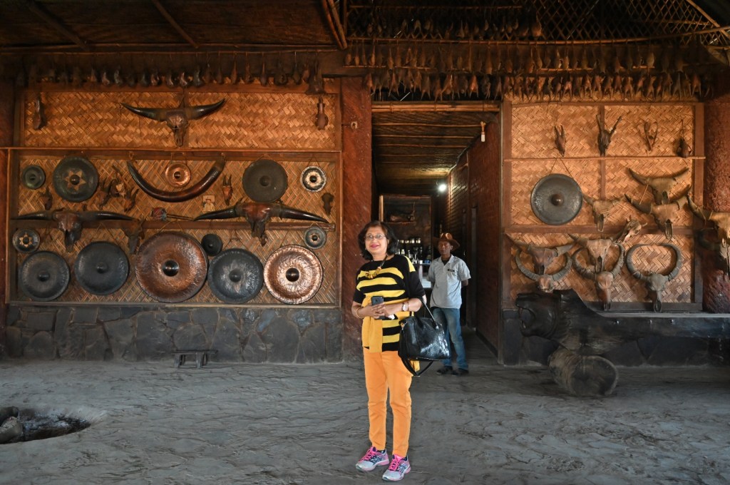 Then the excitement,the old headhunters have arrived.There are three of them.They look frail and must have been above 75 yes of age.Wearing their ceremonial dresses which have seen better days, they meet us.One of them has a child with him.We are told that they still work in the fields.Interacting with tourists and photo sessions are a major source of income for them. One hour passes in a blink.It is time to wonder as to the end of this chapter in our social history.